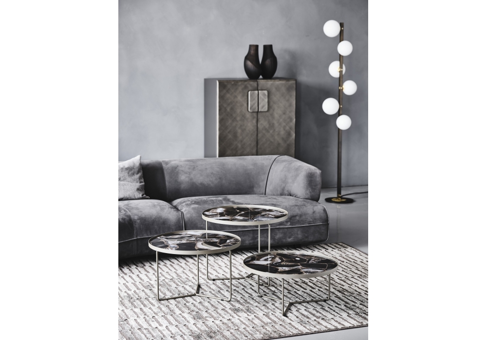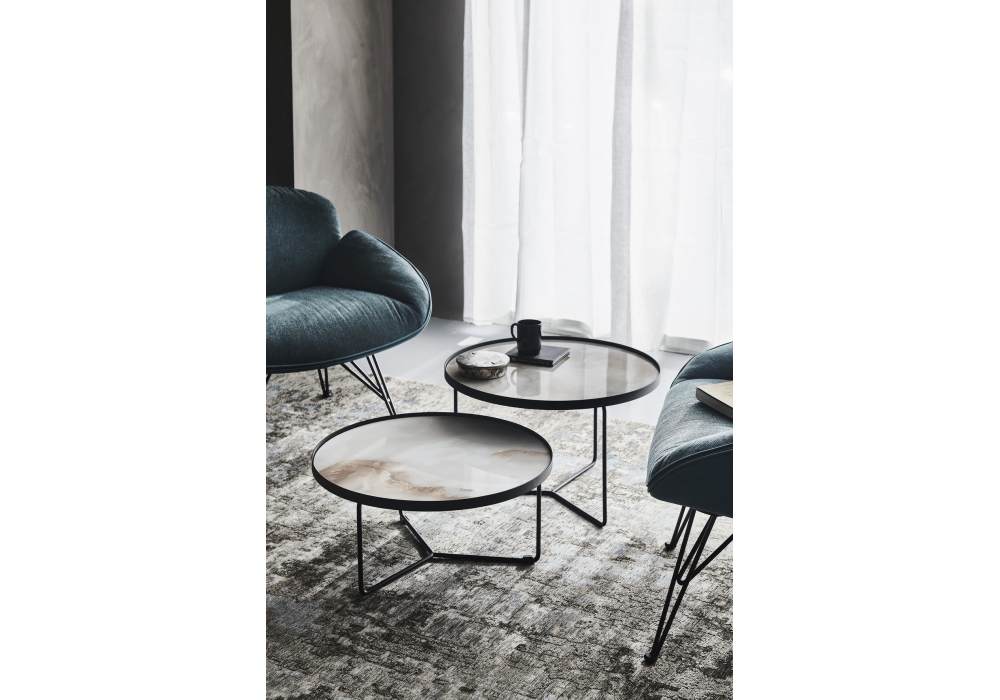 Billy Keramik diseñada por Studio Kronos para Cattelan Italia es una mesita baja con sobre en cerámica Marmi en varios colores. Estructura de acero lacado gofrado negro o titanio o base en Bronze y marco del sobre en Brushed Bronze.