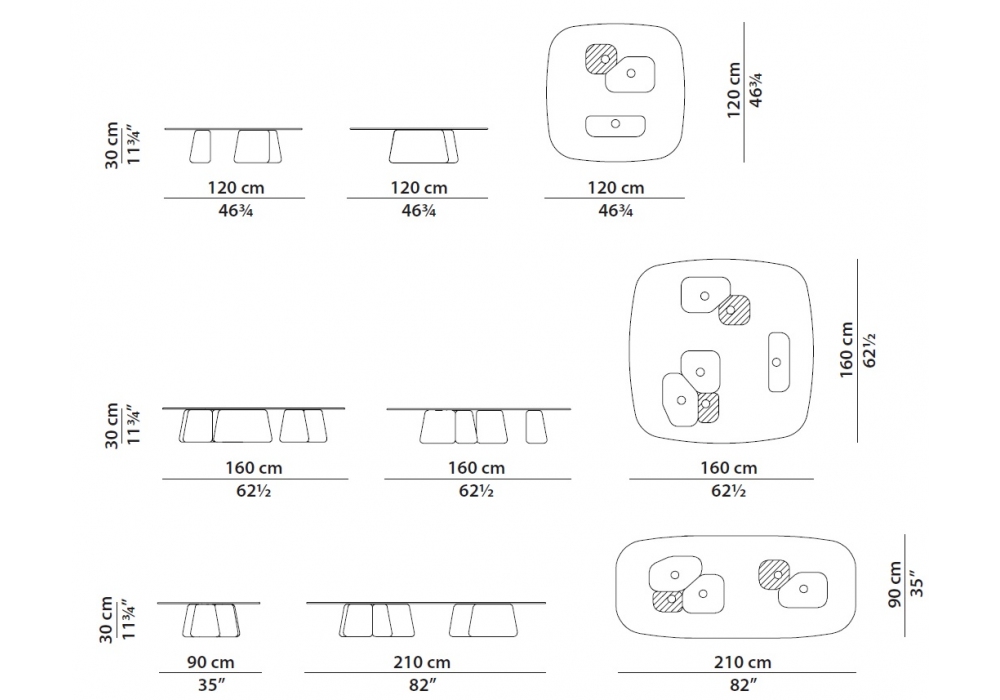 | Dimensiones | 120 x 120 x H 30 cm; 160 x 160 x H 30 cm; 210 x 90 x H 30 cm. |