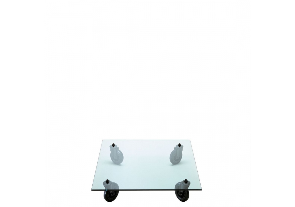 Tavolo con Ruote diseñada por Gae Aulenti para Fontana Arte es una mesita realizada con una placa de vidrio flotado pulido de 15 mm de espesor y ruedas industriales con horquillas de metal pintado de negro. Disponible en diferentes modelos.