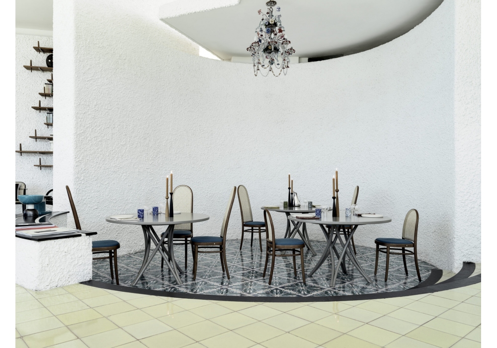 Rehbeintisch diseñada por Gebrüder Thonet Vienna es una mesa de haya con estructura de madera curvada y tablero de chapa de haya barnizada resistente a los arañazos con borde de madera maciza. La mesa está disponible en diferentes acabados y tamaños.