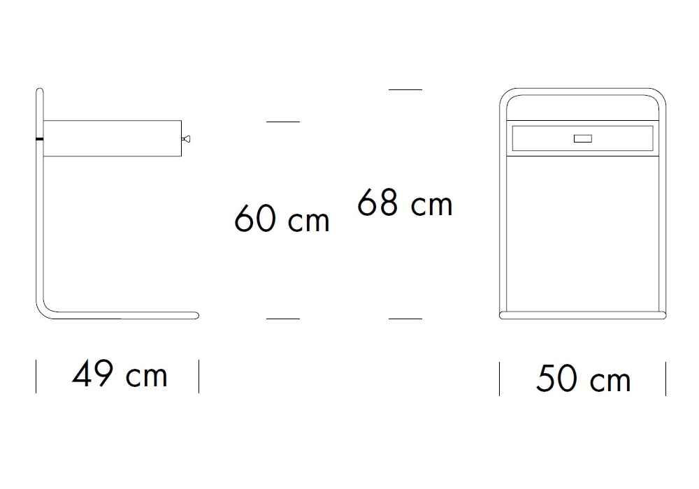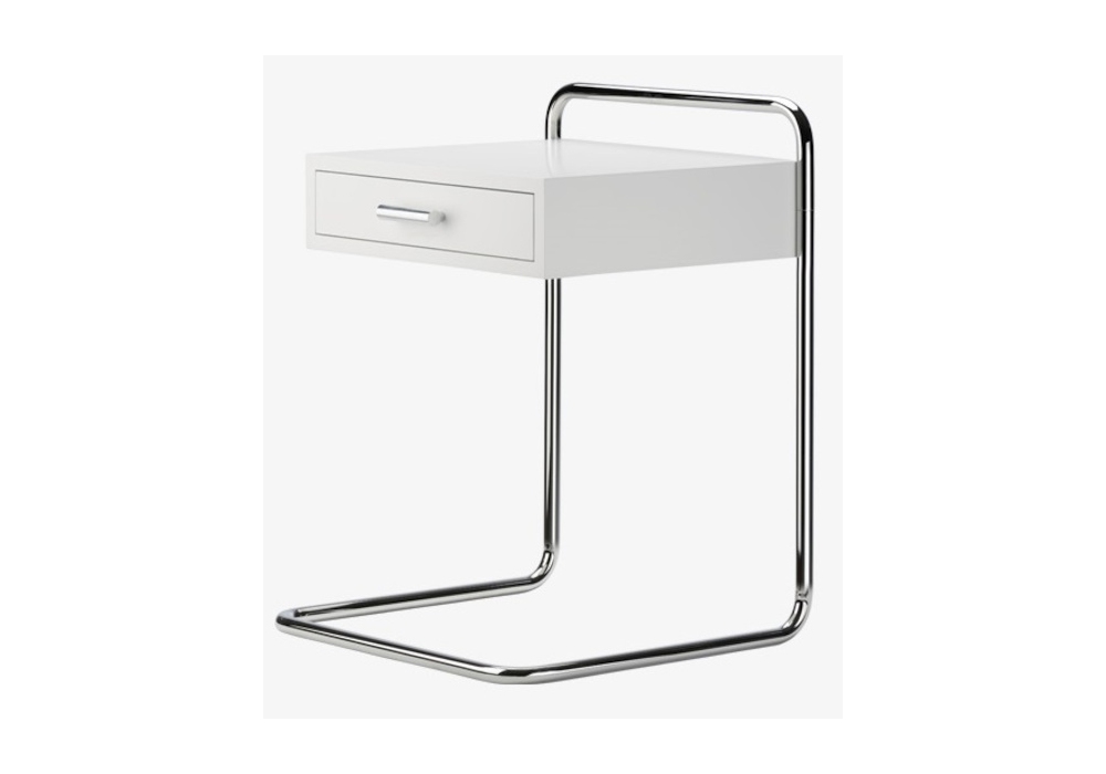 B 117 diseñada por Thonet es una mesa auxiliar con cajón, estructura de acero tubular cromado. Tapa de MDF lacado disponible en varios colores.