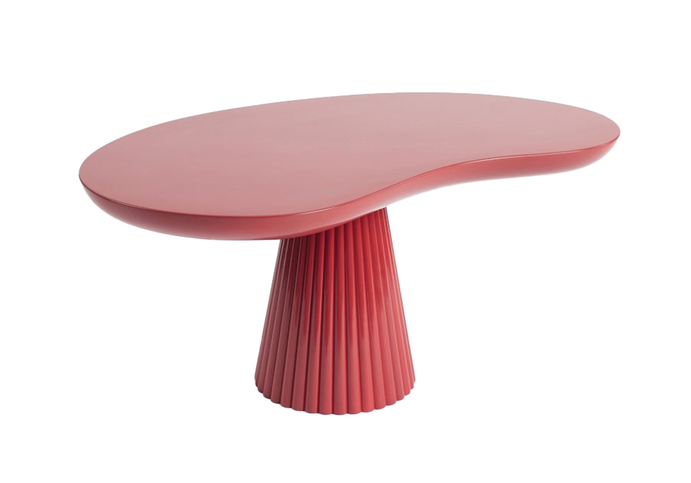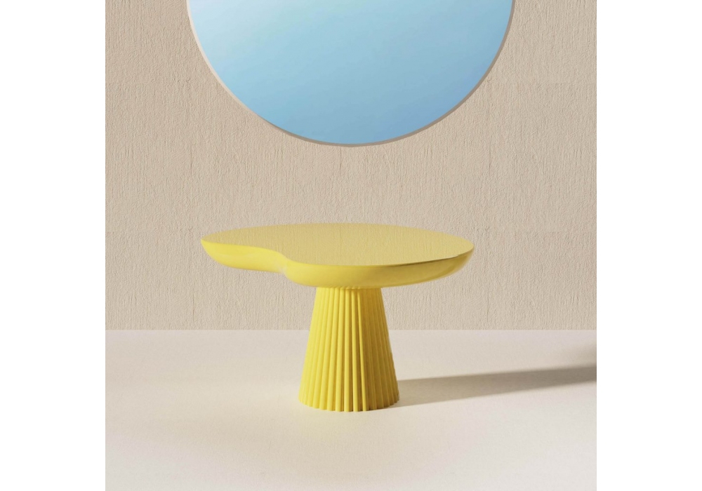 Mira N°2 diseñada por Thomas Dariel para Maison Dada es una mesa auxiliar con tapa de forma abstracta y base cónica rayada, completamente realizada en cerámica pintada en diferentes acabados.