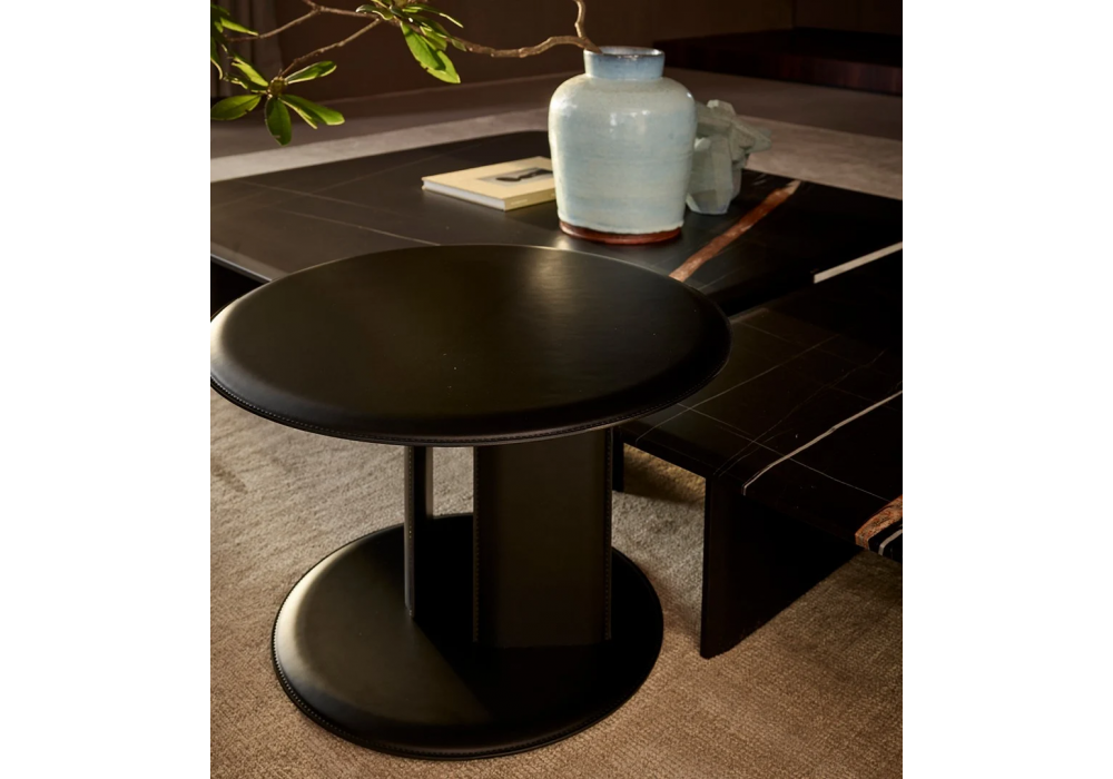 Mush diseñada por Jean-Marie Massaud para Poliform es una mesa auxiliar redonda disponible en olmo negro o con revestimiento en cuero. Bandeja opcional en olmo negro.