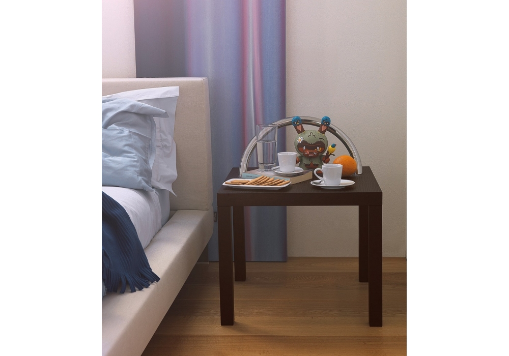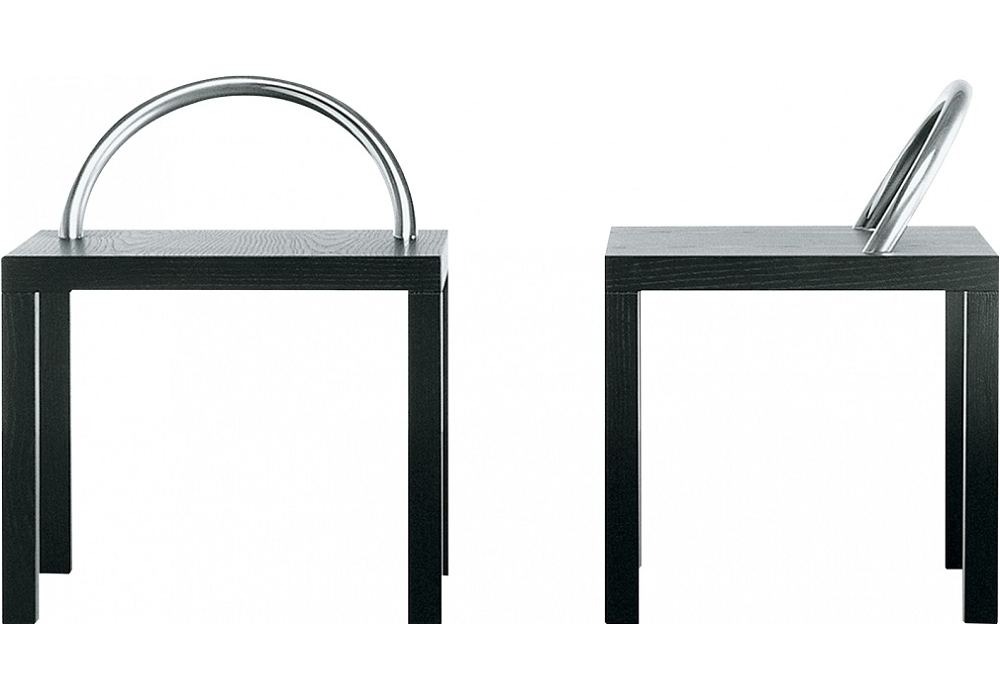 Ko-Ko diseñada por Shiro Kuramata para Cappellini es una mesita cuadrada en madera de fresno teñida de negro con asa en metal cromado pulido.