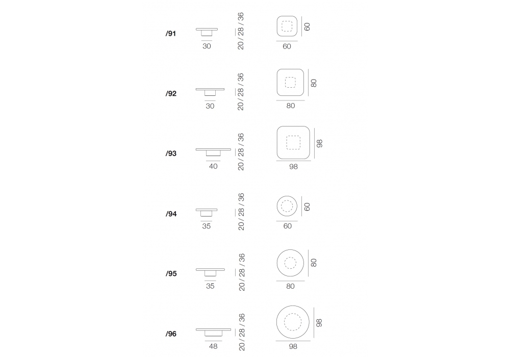 | Altura | 20 cm; 28 cm; 36 cm. |