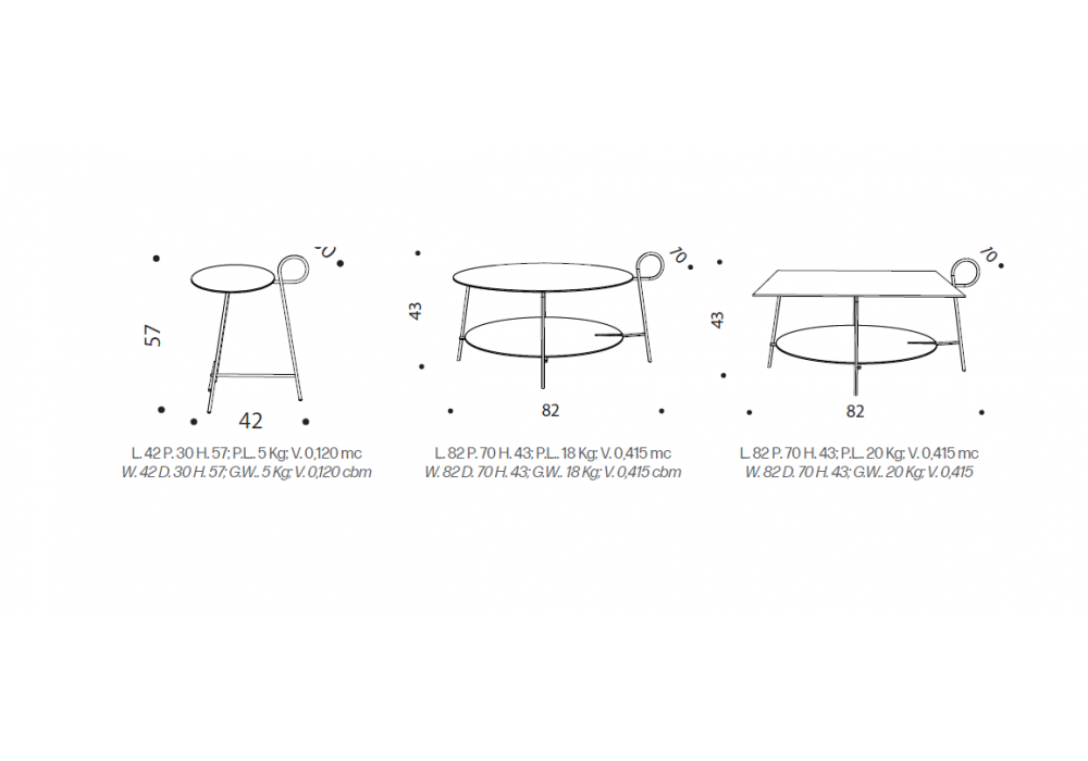 | Dimensiones | - 42 x 30 x H 57 cm; - Ø 82 x 70 x H 43 cm; - 82 x 70 x H 43 cm. |