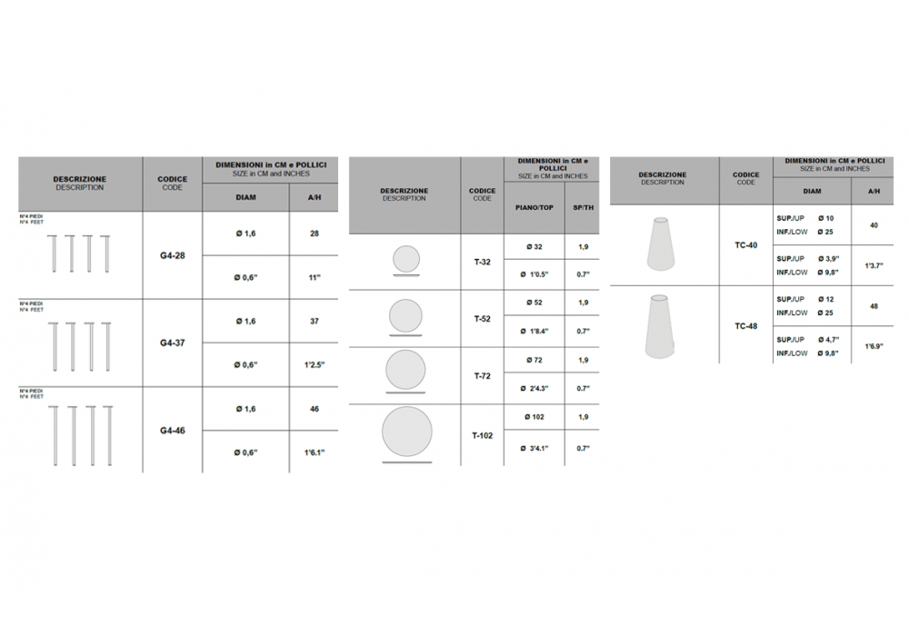 | Dimensiones | - Ø 32 cm; - Ø 52 cm; - Ø 72 cm; - Ø 102 cm. |
