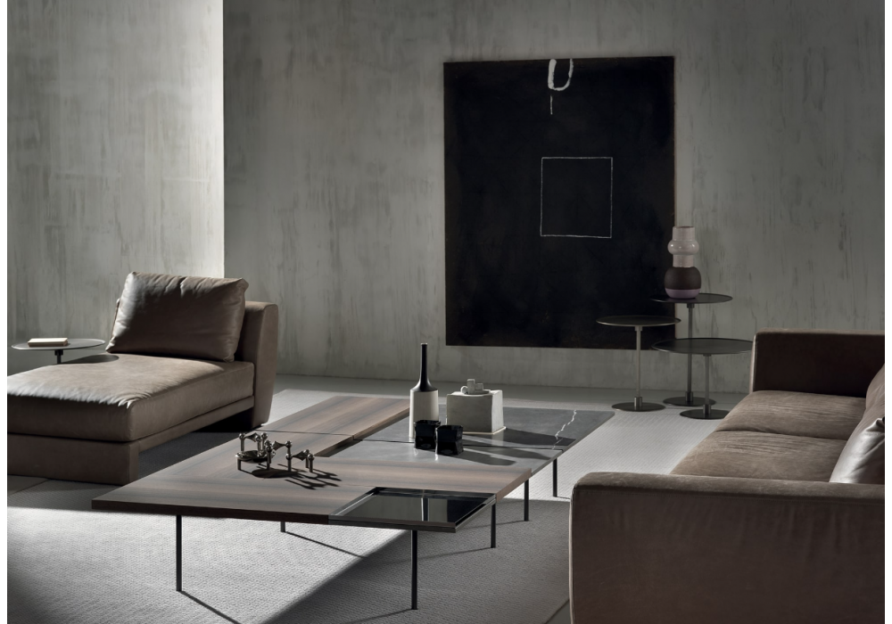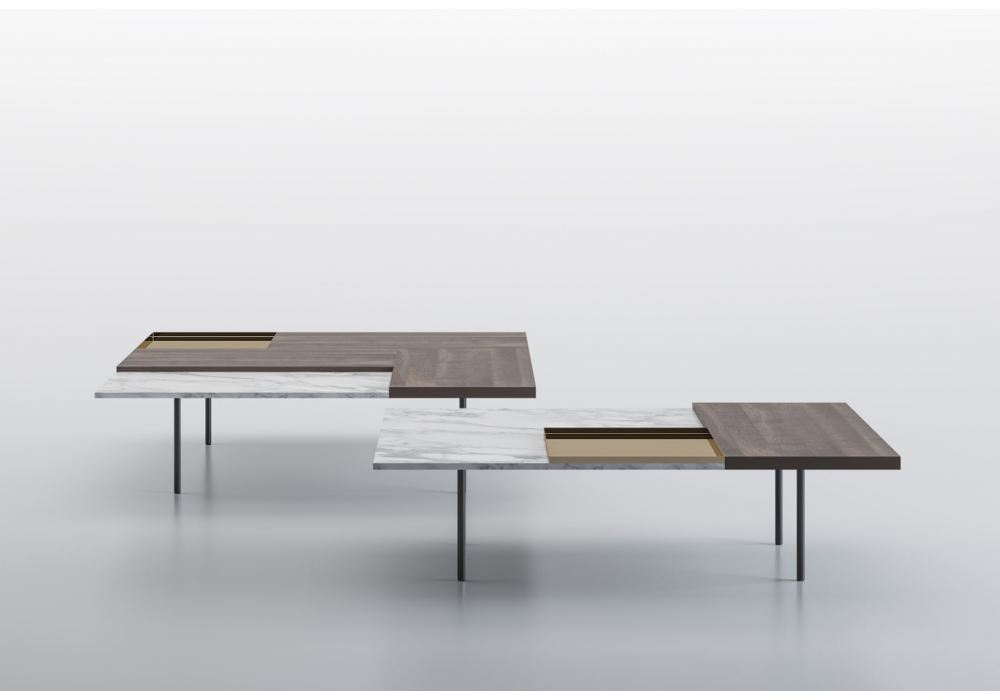 Moodboard diseñada por Massimo Mariani para Acerbis es una mesita con base en acero pintado con polvo epoxi en acabado gris micáceo, tapa en madera, nogal teñido oscuro o fresno de pantano de 30 mm de espesor, o en mármol, guilloché blanco mate o grafito mate de 15 mm de espesor. Bandeja en acero pulido o acero latonado pulido. Disponible en varios tamaños.