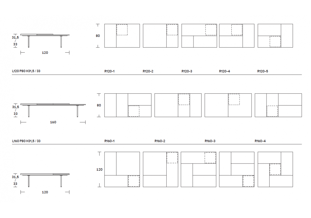 | Dimensiones | - 120 x 80 x H 33 cm; - 160 x 80 x H 33 cm; - 120 x 120 x H 33 cm. |