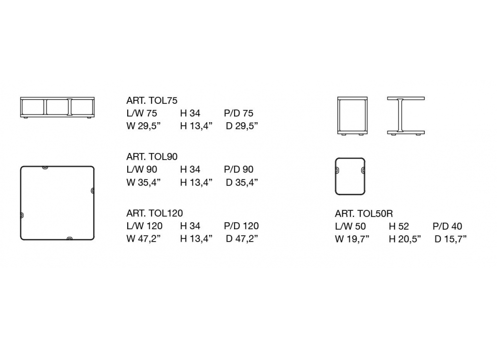 | Dimensiones | 75 x 75 x H 34 cm; 90 x 90 x H 34 cm; 120 x 120 x H 34 cm; 50 x 40 x H 52 cm. |