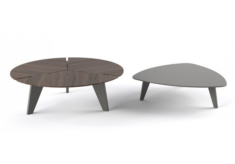 Trevo Round diseñada y producida por Gual Design es una mesita redonda con pies lacados mate y tapa enchapada en nogal, eucalipto, roble o ébano. Disponible en diferentes acabados.