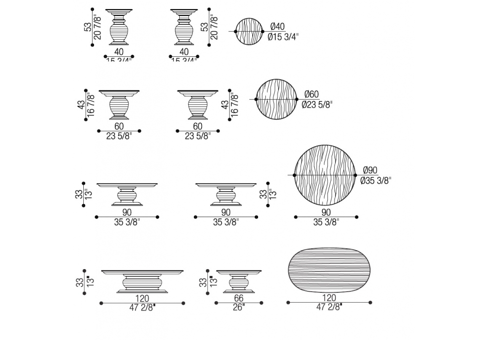 | Dimensiones | Ø 40 x H 53 cm; Ø 60 x H 43 cm; Ø 90 x H 33 cm; 120 x 66 x H 33 cm. |
