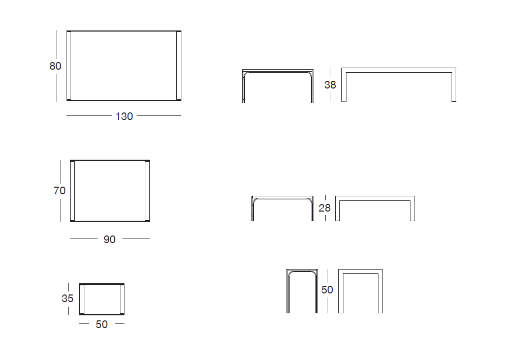 | Dimensiones | 130 x 80 x H 38 cm; 90 x 70 x H 28 cm; 50 x 35 x H 50 cm. |