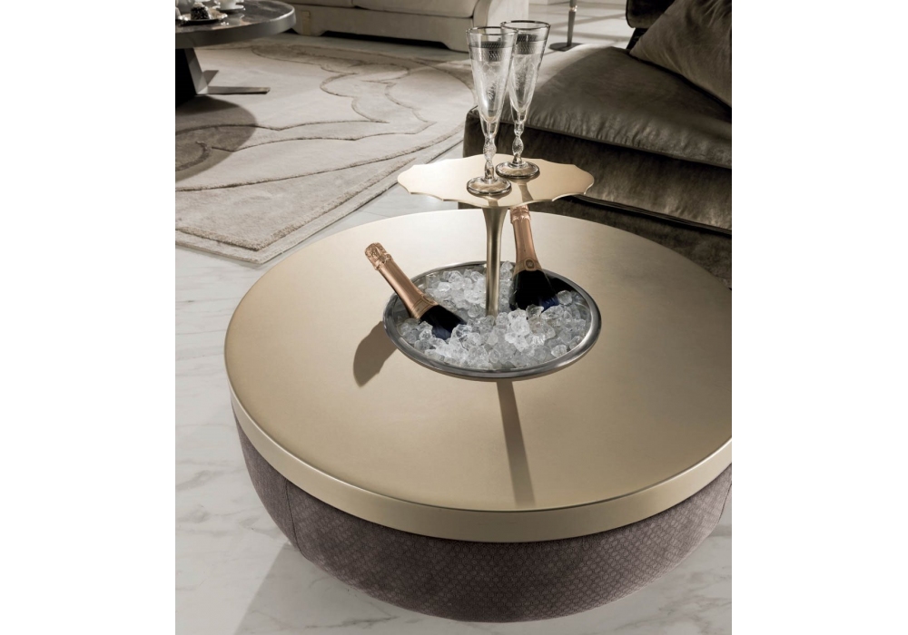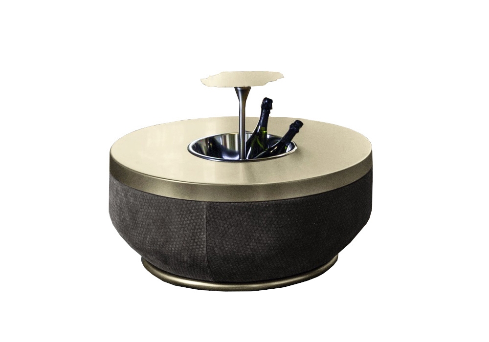 Godwin Bar diseñada por Giuseppe Iasparra para Longhi es una mesa de bar con estructura en fibra de vidrio revestida en piel. Sobre, columna y base en metal brillo o mate. Seau à glace en acero inoxidable extraíble insertado en la parte superior.