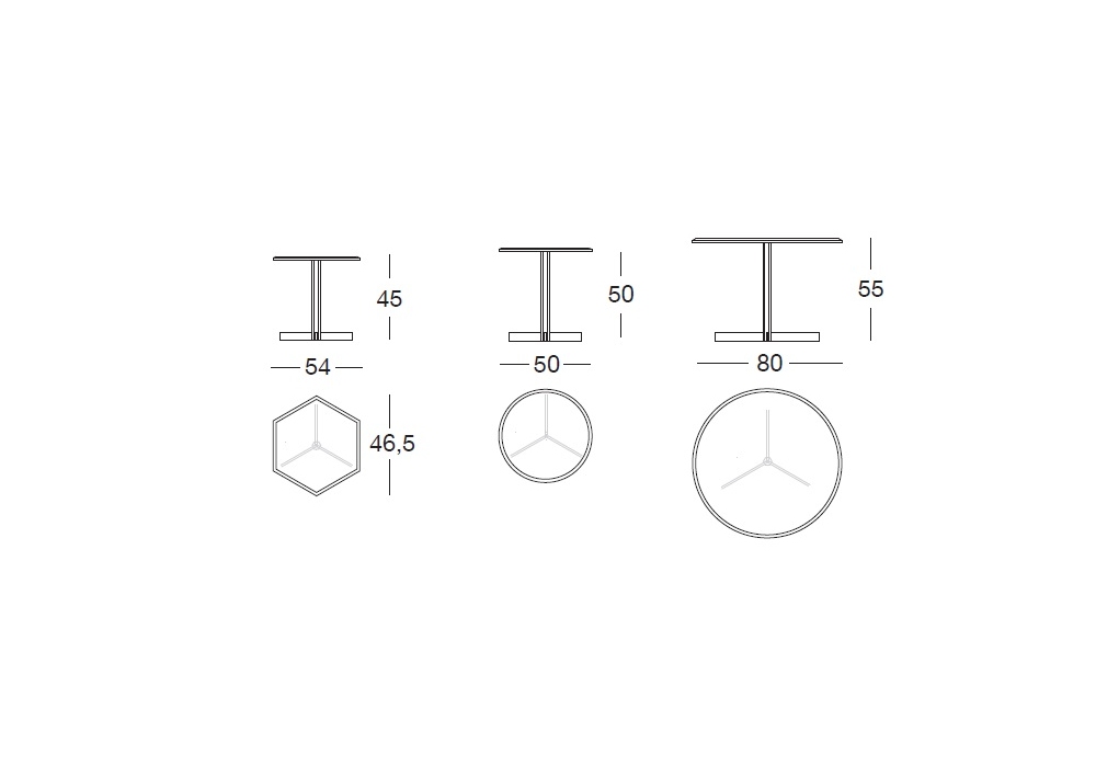 | Dimensiones | 54 x 46.5 x H 45 cm; Ø 50 x H 50 cm; Ø 80 x H 55 cm. |