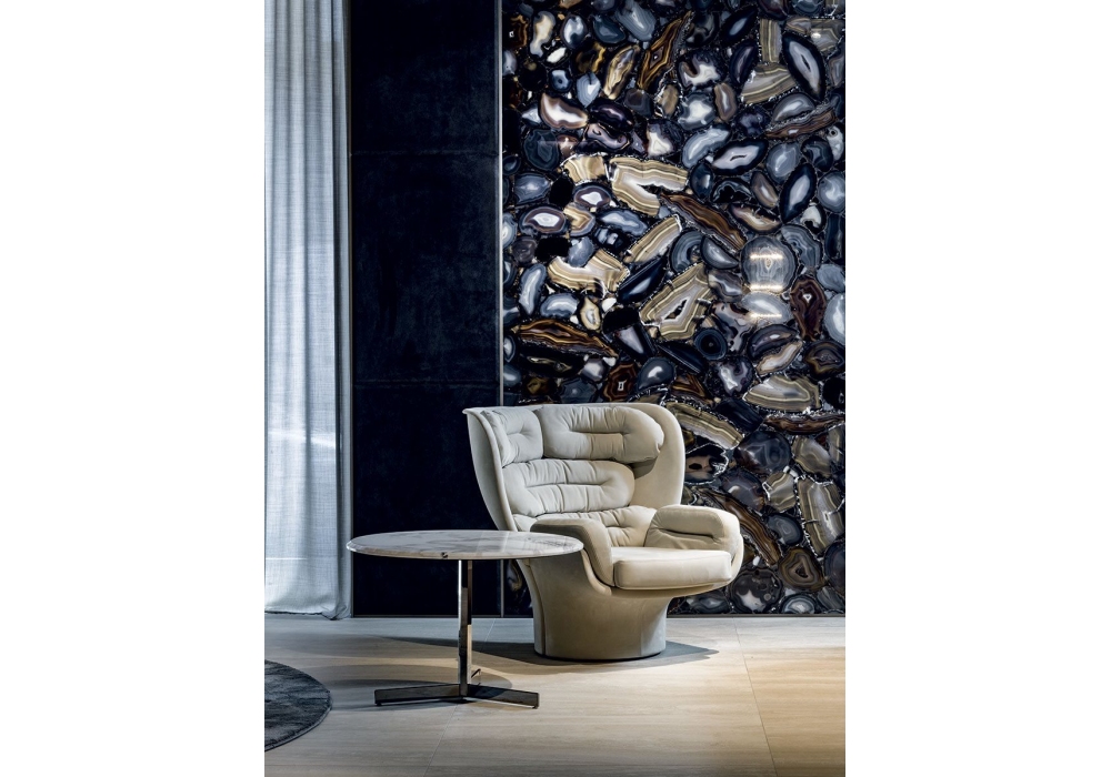 Math diseñada por AL1 para Longhi es una mesita con base en metal rectificado en acabado brillante o mate y tablero en mármol, ónix o espejo. Disponible en diferentes dimensiones.