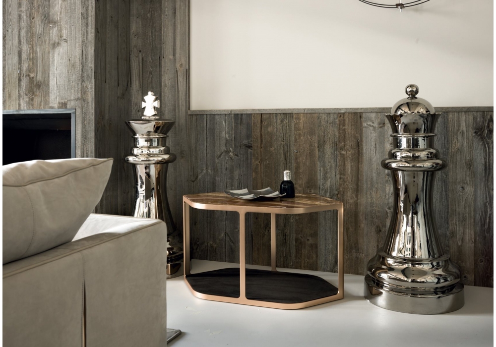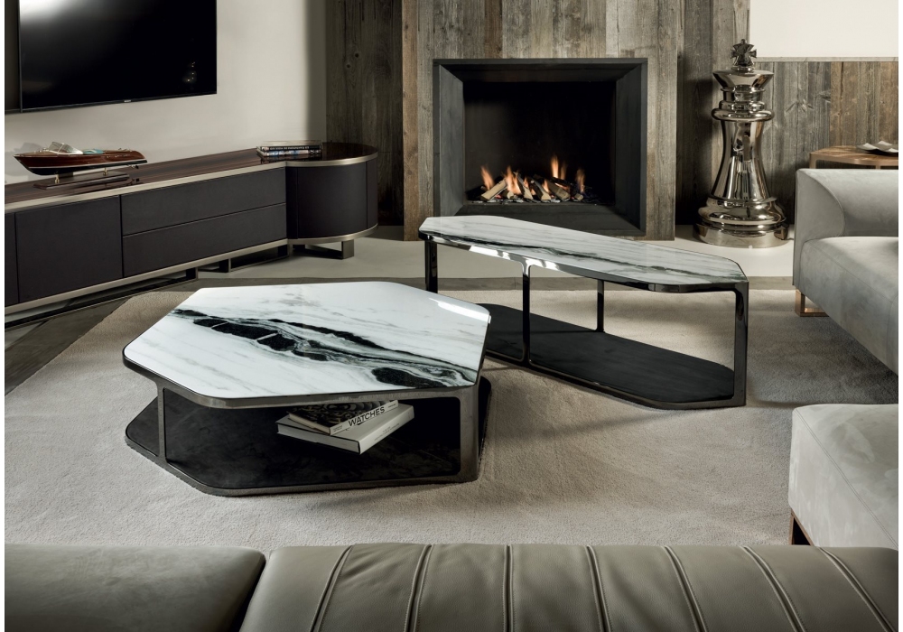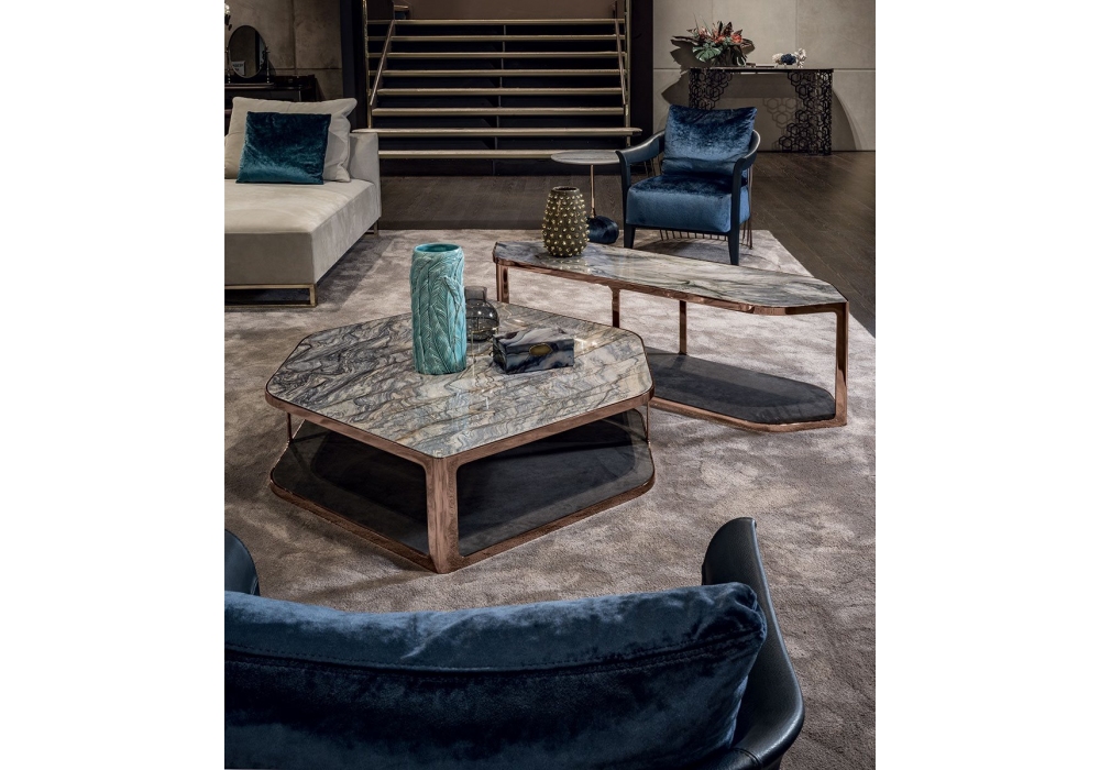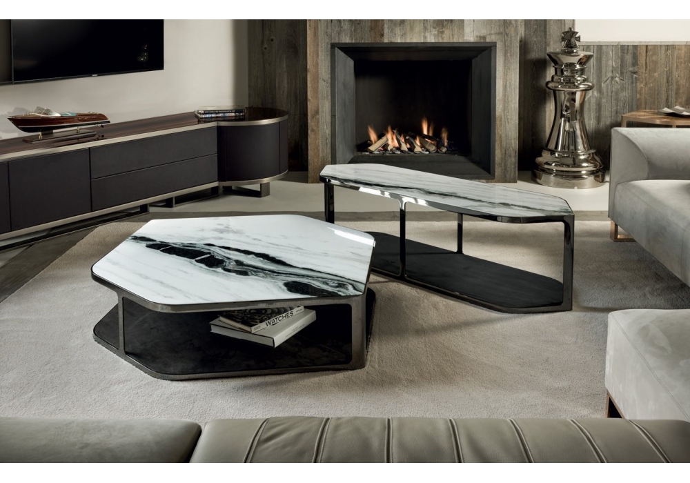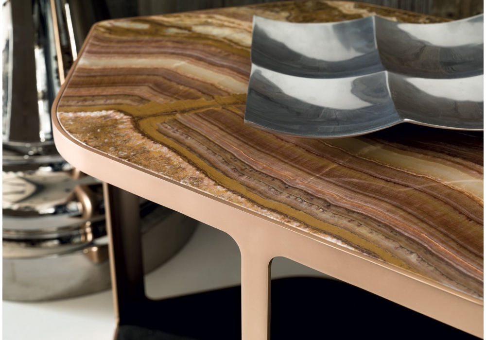 Tiles diseñada por Giuseppe La Spada para Longhi es una mesita con estructura de metal cortado con láser en acabado brillante o mate, tubo de mármol, espejo u ónix y base revestida en cuero. Disponible en diferentes dimensiones.