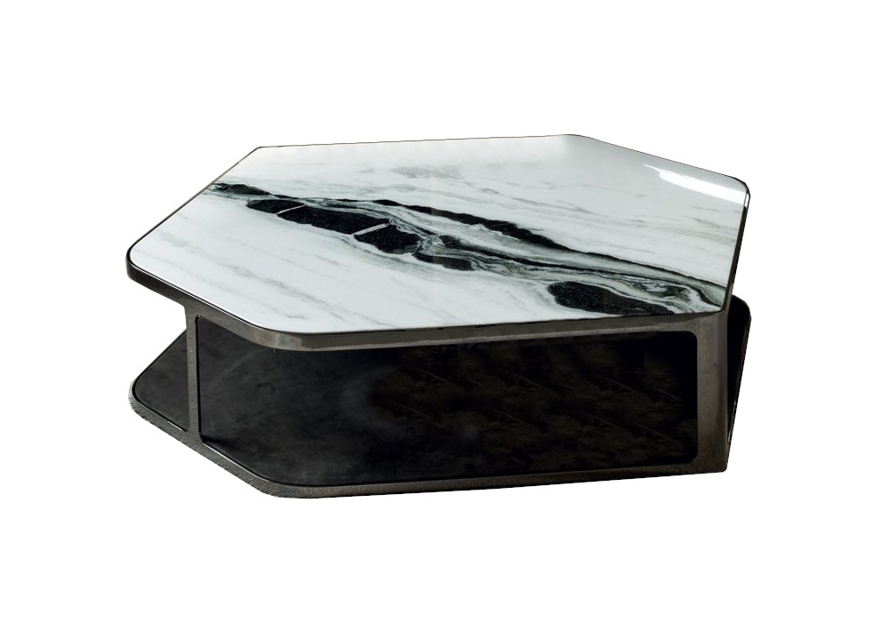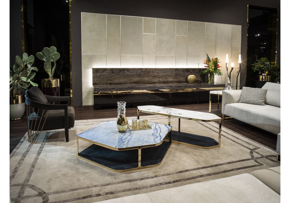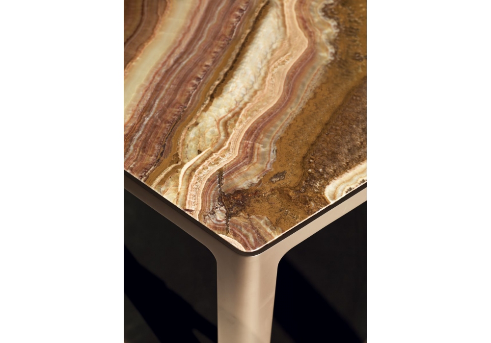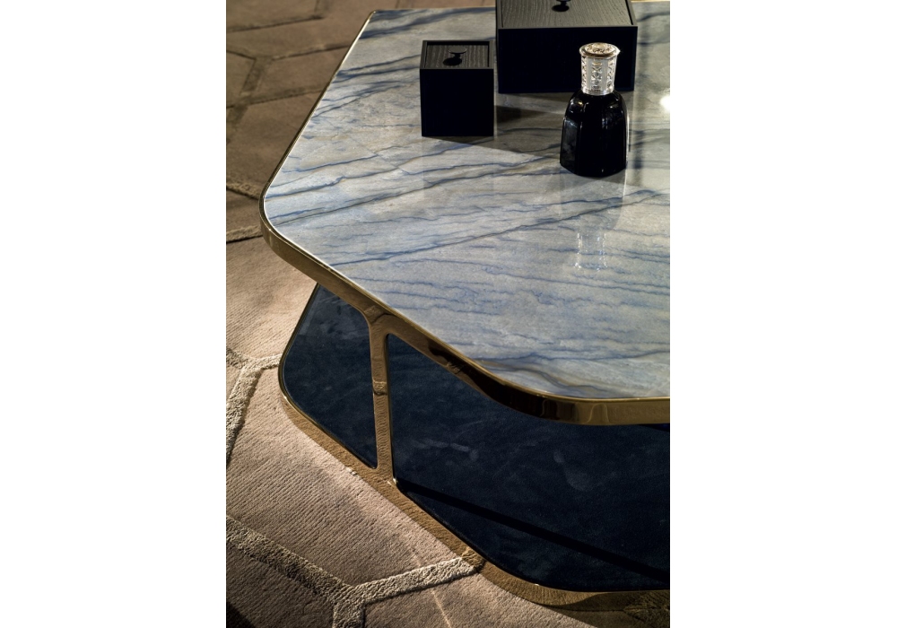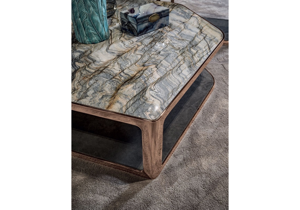 Tiles diseñada por Giuseppe La Spada para Longhi es una mesita con estructura de metal cortado con láser en acabado brillante o mate, tubo de mármol, espejo u ónix y base revestida en cuero. Disponible en diferentes dimensiones.