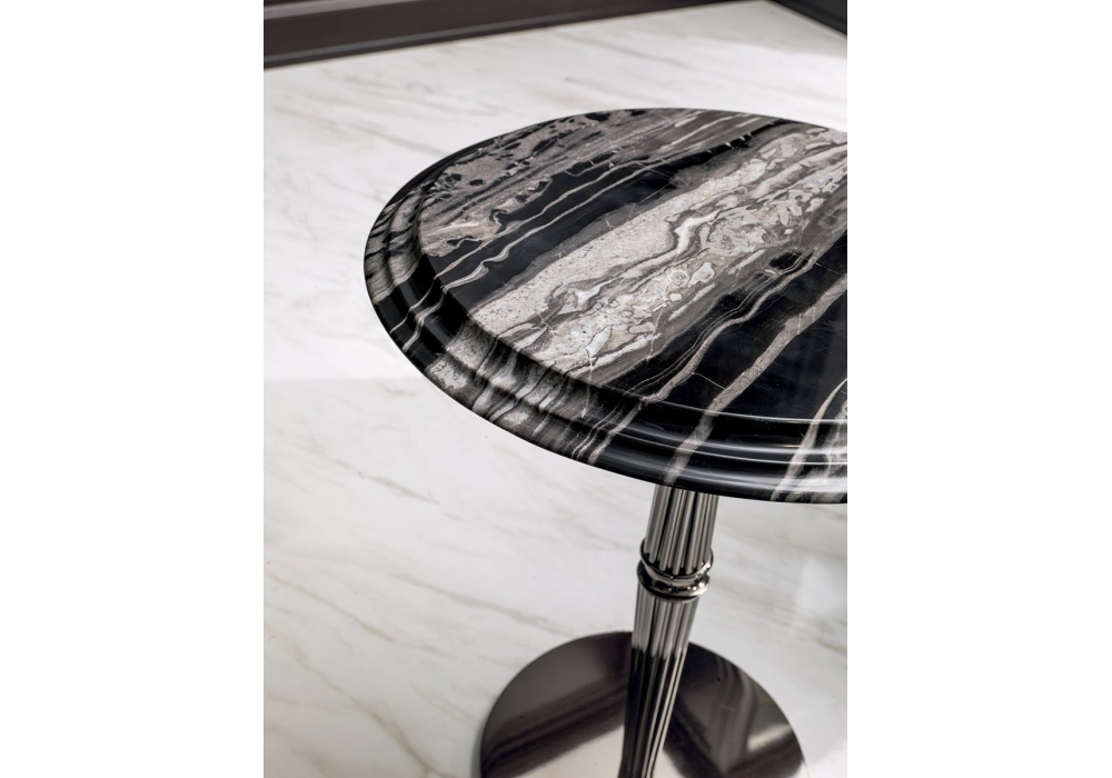 Gueridon Marble diseñada por Giuseppe Iasparra para Loghi es una mesa auxiliar con tablero en mármol y estructura en metal brillante o mate. Bajo pedido está disponible la versión con columna revestida en cuero y/o con aro de metal torneado como base.