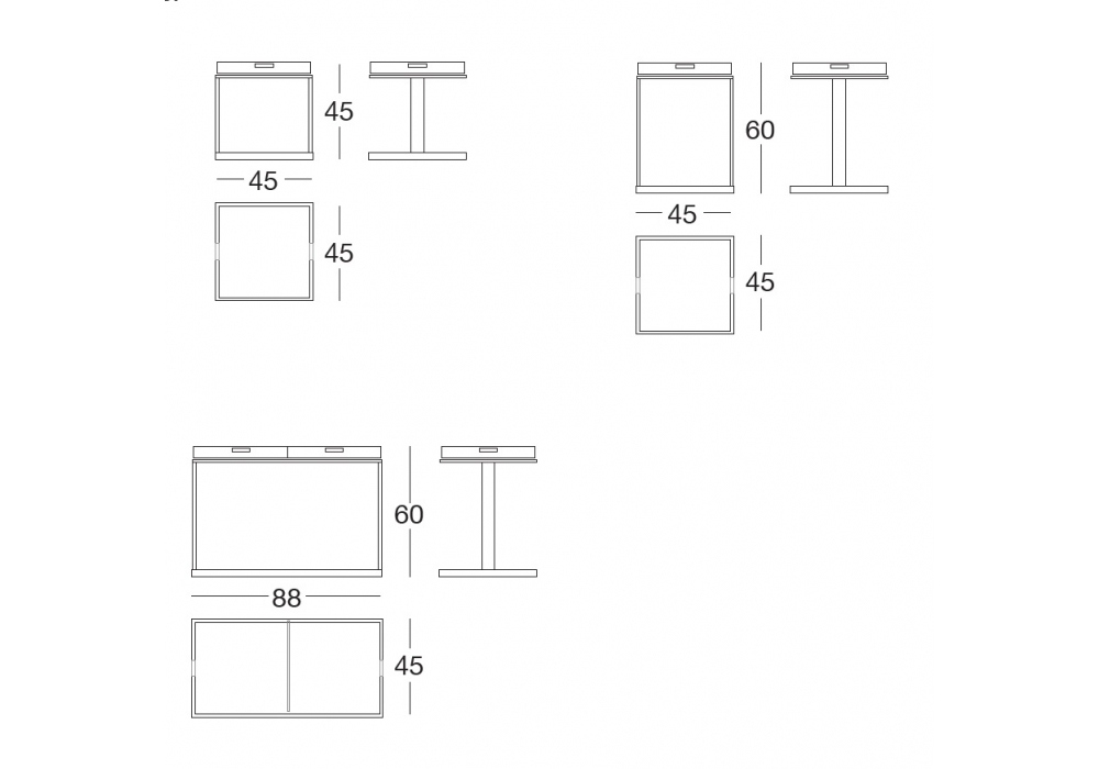 | Dimensiones | 45 x 45 x H 45 cm; 45 x 45 x H 60 cm; 88 x 45 x H 60 cm. |