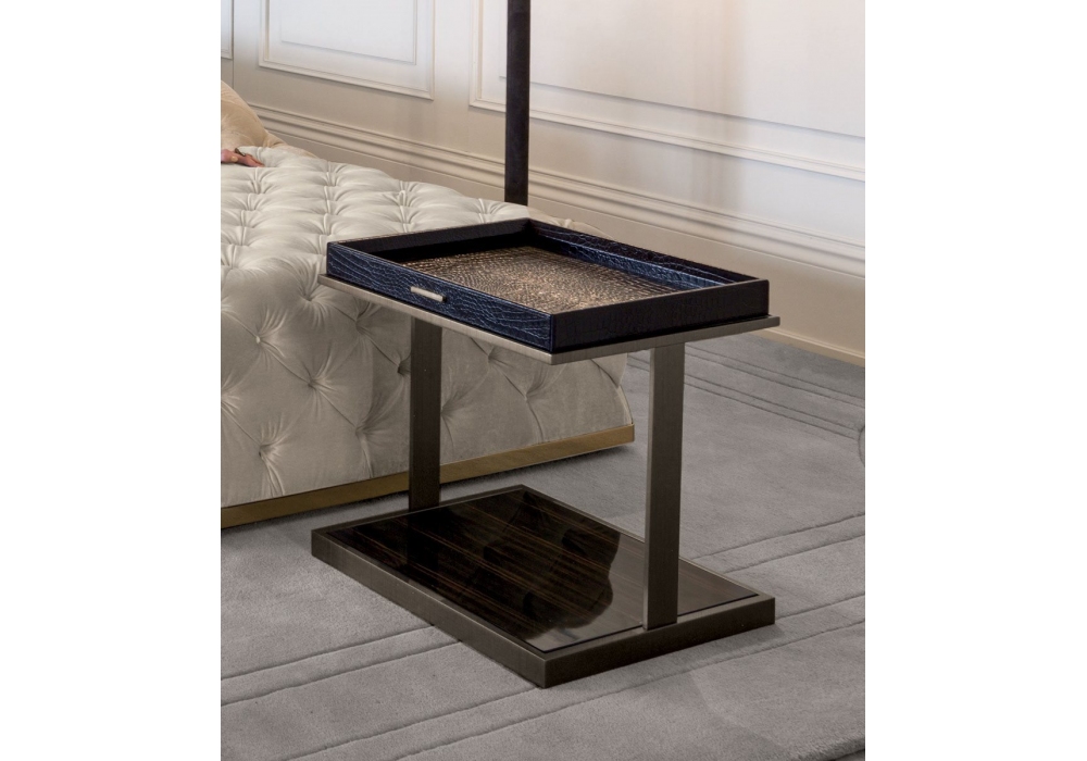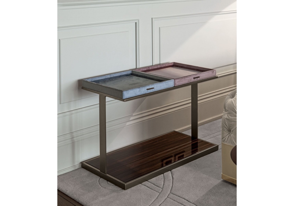 Louis diseñada por Giuseppe Iasparra para Longhi es una mesita con estructura en metal. Bandeja extraíble tapizada en piel, terciopelo o madera. Base y tapa de madera en acabado brillo o mate. Disponible en diferentes dimensiones.