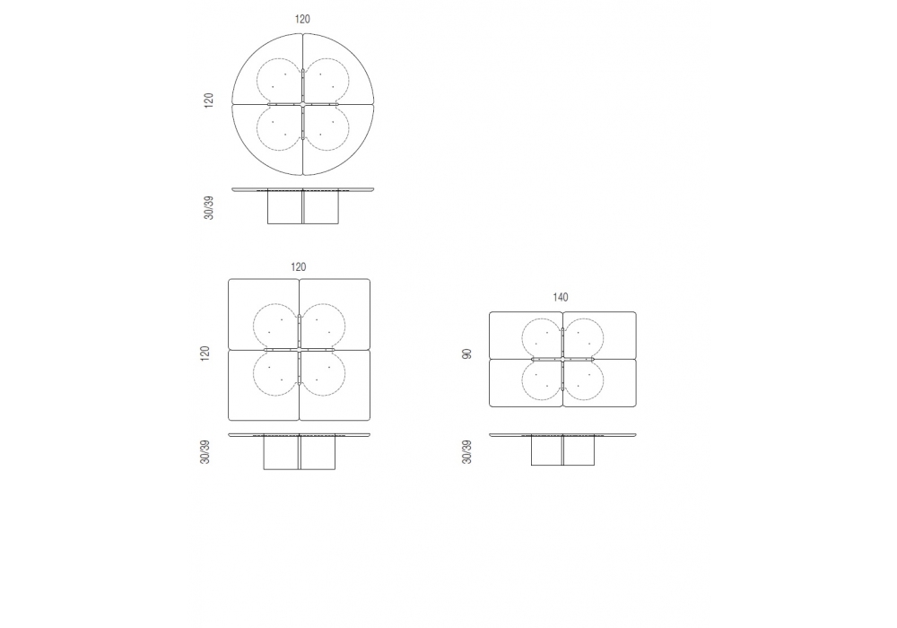 | Dimensiones | Ø 120 x H 30/39 cm; 120 x 120 x H 30/39 cm; 140 x 90 x H 30/39 cm. |