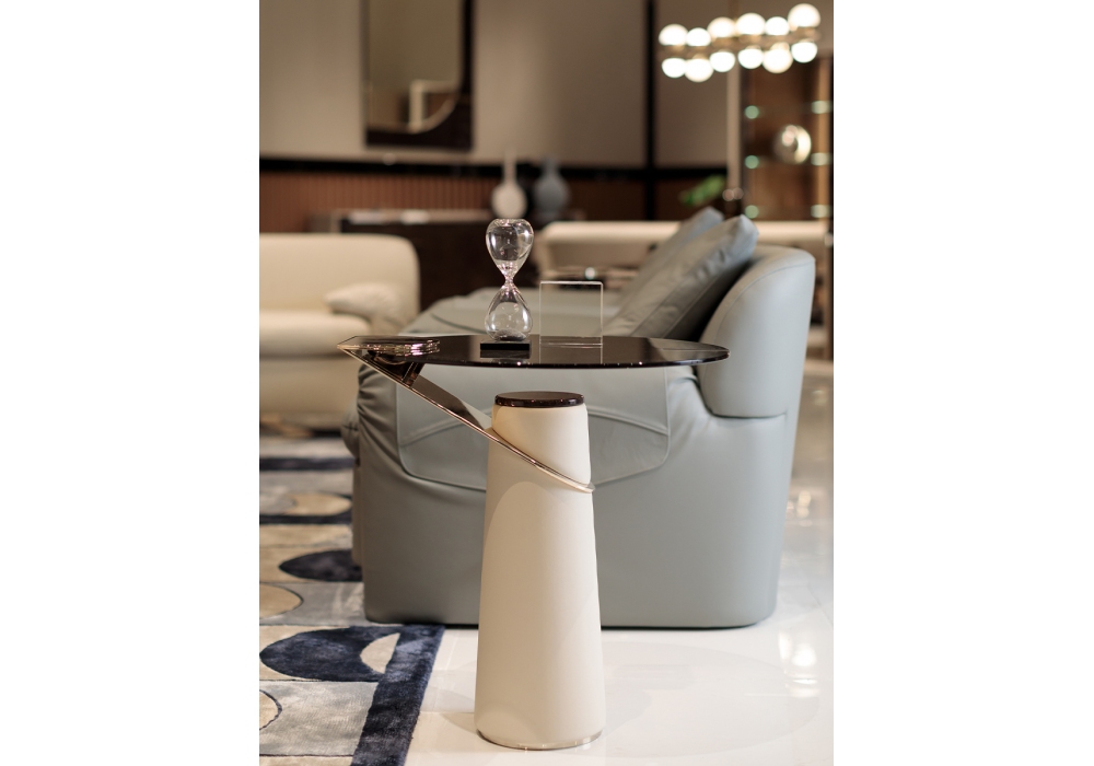 Eclipse diseñada por Andrea Bonini para Turri es una mesa auxiliar con base en MDF y contrachapado en diferentes acabados de poliéster brillante decorados a mano y tapizado en piel. La parte superior es de cristal bronceado y está sostenida por un elemento de metal con un acabado dorado claro.
