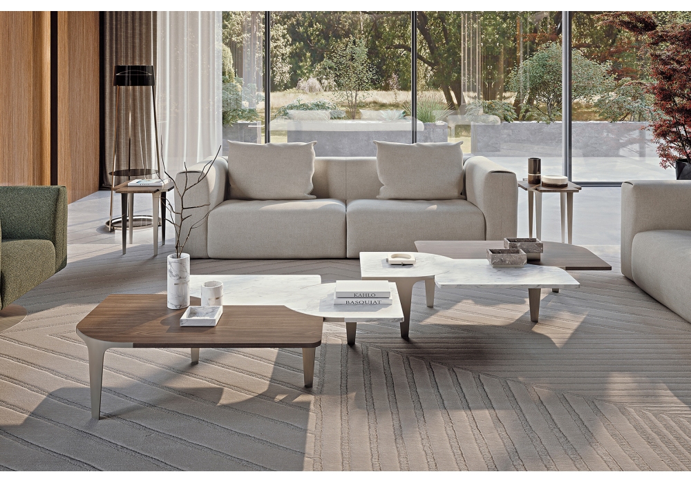 Soul diseñada por Giuseppe Viganò para Turri es una mesa auxiliar con estructura de metal en acabado mate. La tapa está dividida en dos cuerpos y está realizada con un tablero de partículas chapado en nogal o con una parte de mármol.