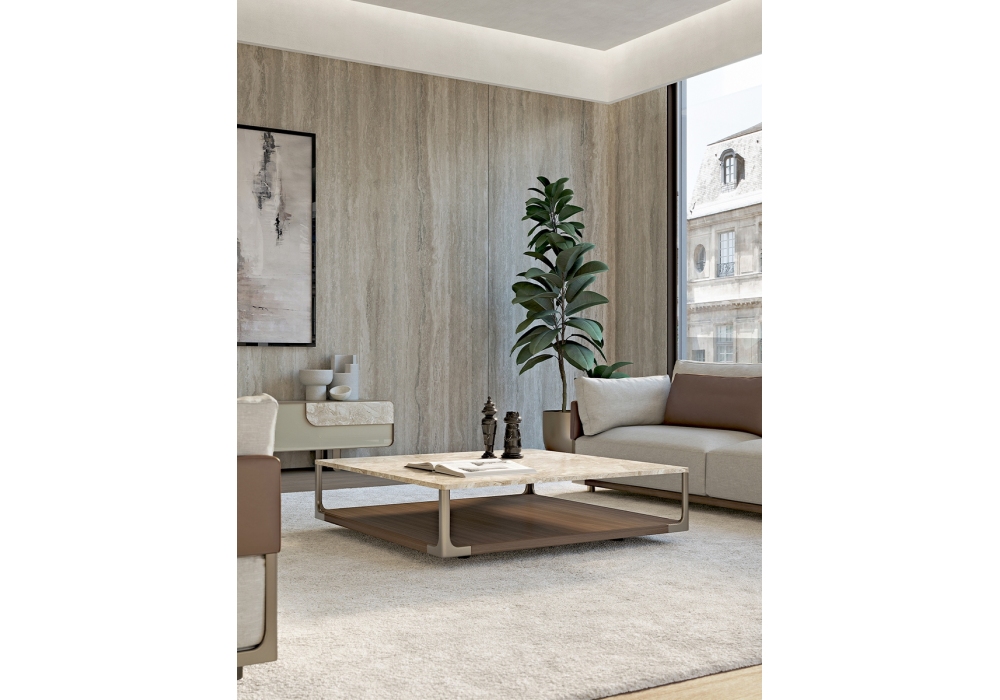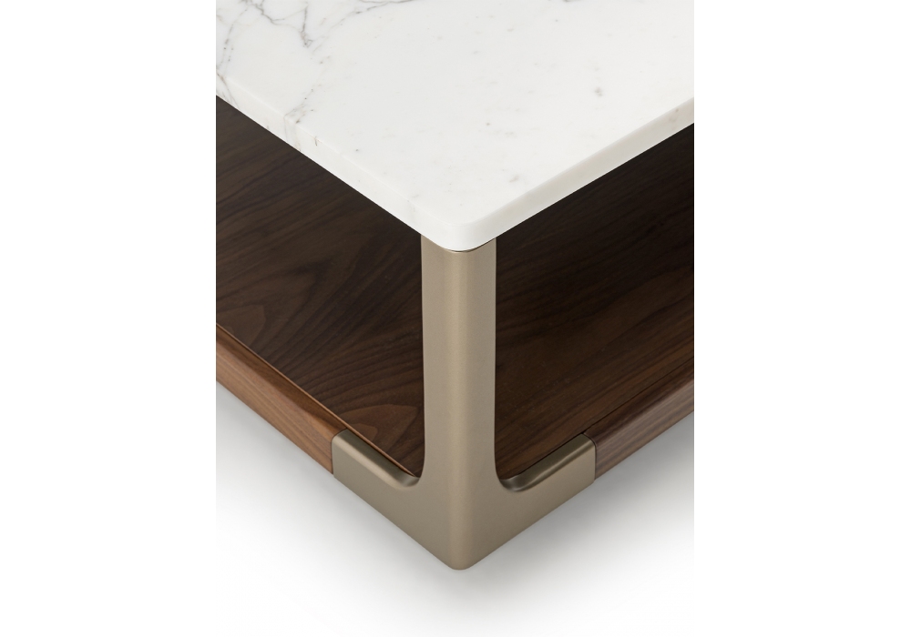 Drum diseñada por Giuseppe Viganò para Turri es una mesita con estructura en madera chapada en nogal con detalles de metal en acabado platino claro mate. Tapa formada por partículas de madera chapada en nogal o mármol. Disponible en diferentes dimensiones.