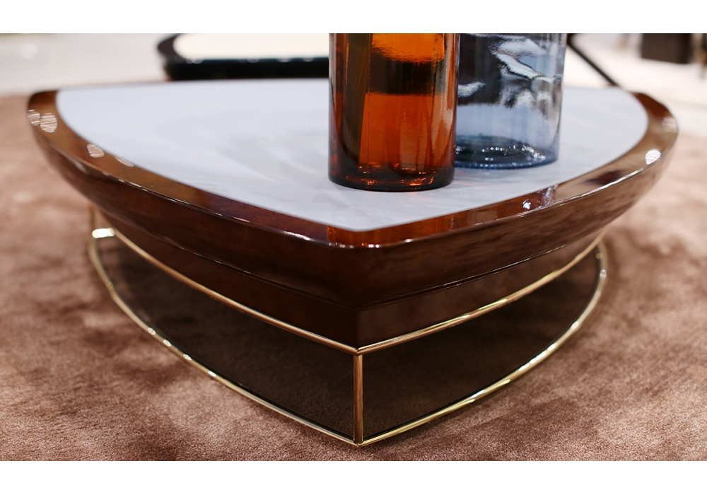 Madison diseñada por Andrea Bonini para Turri es una mesita con estructura de MDF acabado poliéster brillante decorado a mano. En la parte superior hay inserciones de cuero. Patas de metal en acabado dorado claro. Disponible en diferentes dimensiones.