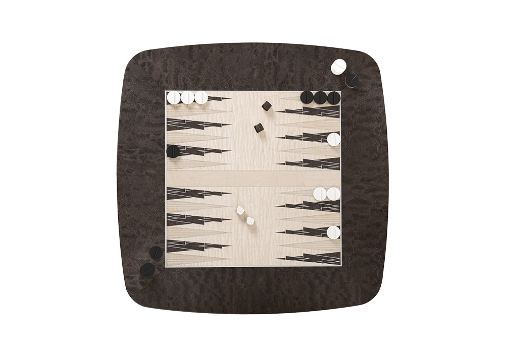 Spark Game diseñada y producida por Giorgetti es una mesita con estructura en aluminio pintado acabado Peltre y fresno gris antracita, y tapa en caoba sapelli gris antracita y arce sicómoro. Disponible con incrustaciones de tablero de ajedrez o de backgammon.