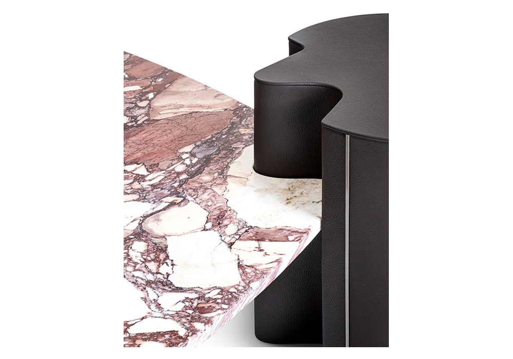 Mia diseñada y producida por Giorgetti es una mesita con base tapizada en cuero y tapa en nogal Canaletto o mármol, en diferentes acabados. Se puede combinar con la mesa de centro Woody, gracias a la parte superior perfilada en una sola esquina.