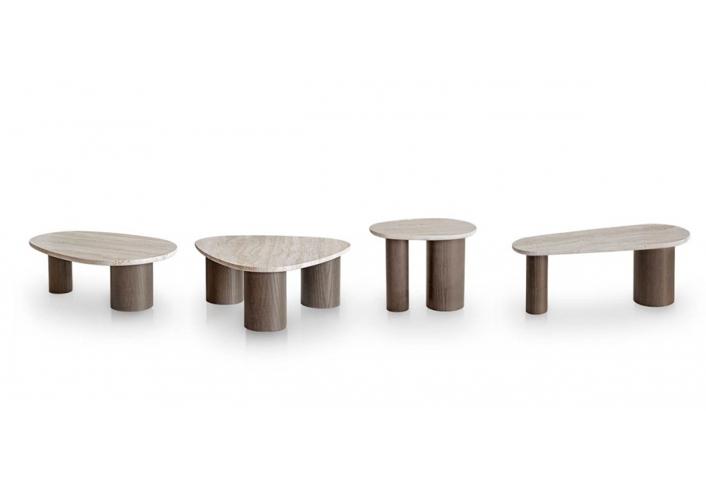 Jade diseñada por Hanne Willmann para Potocco es una mesa auxiliar con base doble en madera de fresno y tablero en varios tipos de mármol.