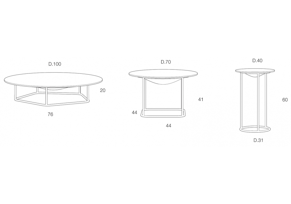 | Dimensiones | • Ø 40 x H 60 cm; • Ø 70 x H 41 cm; • Ø 100 x H 20 cm |