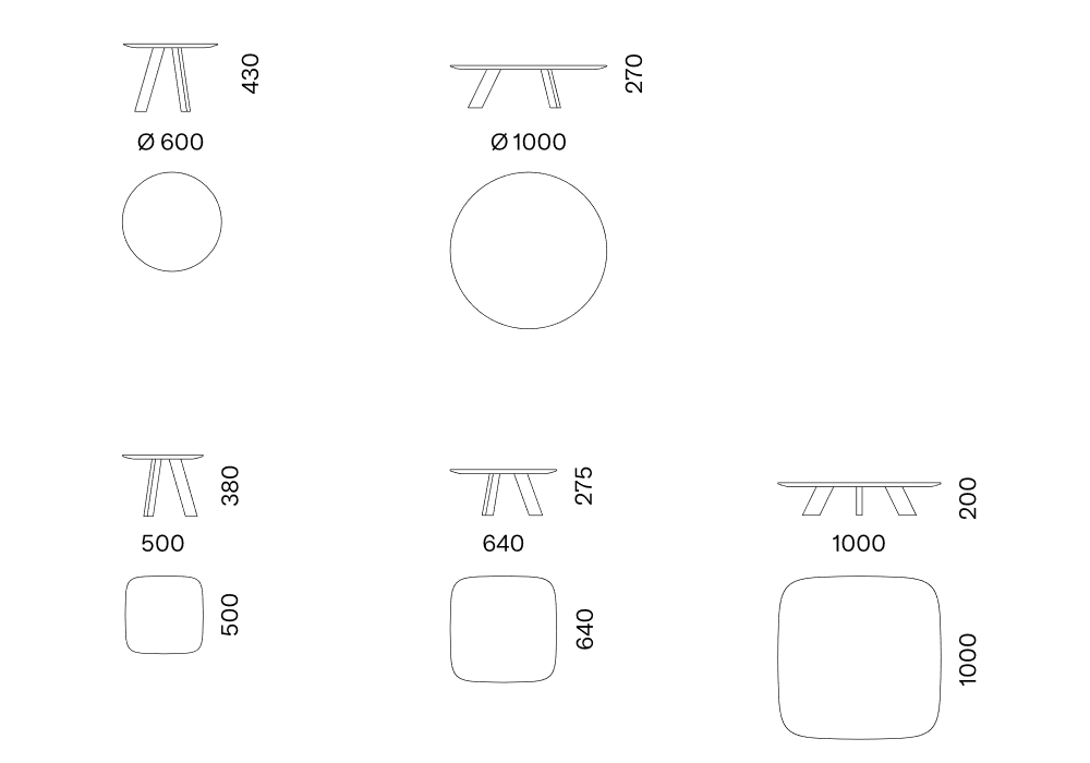 | Dimensiones | 50 x 50 x H 38 cm; 64 x 64 x H 27.5 cm; 100 x 100 x H 20 cm; Ø 60 x H 43 cm; Ø 100 x H 27 cm. |
