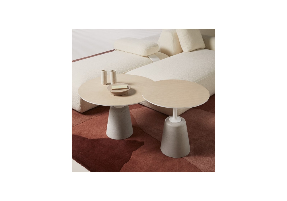 Rock Table Mini diseñada por Jean Marie Massaud para MDF Italia es una mesita con tablero redondo. La base es de hormigón aligerado y soporta la encimera, disponible en varios materiales y acabados. La mesa, realizada con una tapa de hormigón, también es apta para uso en exteriores.