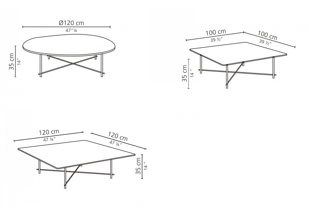 | Dimensiones | Ø 120 x H 35 cm; 100 x 100 x H 35 cm; 120 x 120 x H 35 cm. |