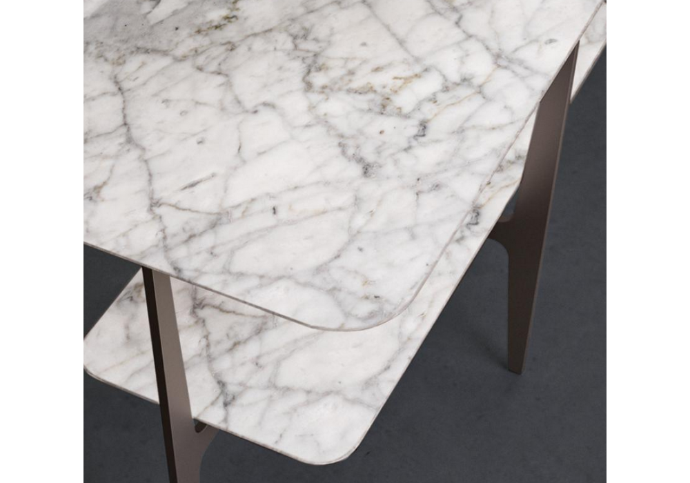 Dupré diseñada por Roberto Lazzeroni para Casamilano es una mesita con estructura de metal pintado bronce y tapas de mármol.