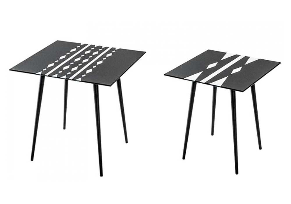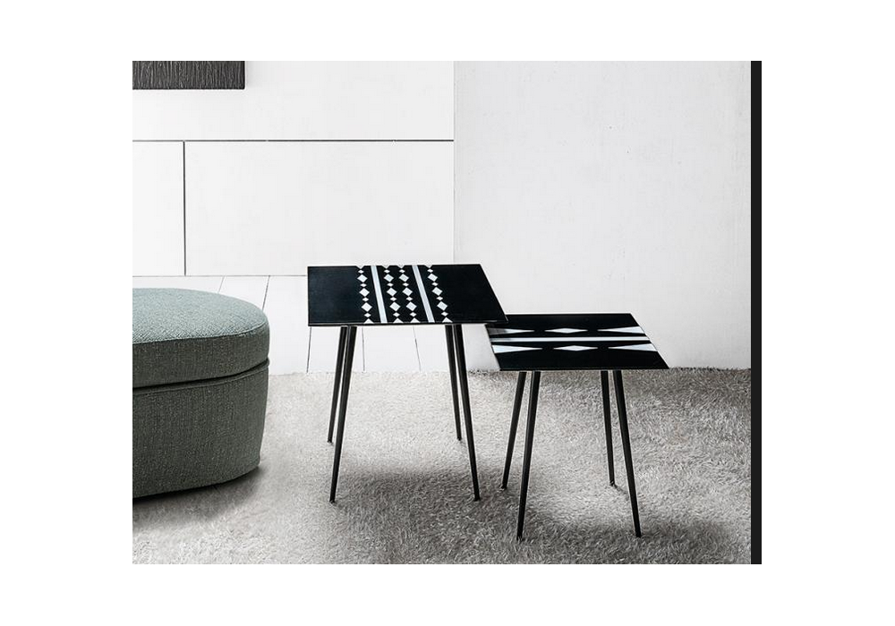 Suitable BN diseñada por Lia Bosch, Painter para Casamilano es una mesa auxiliar con tablero de MDF decorado con impresión digital y base de metal pintado de negro.