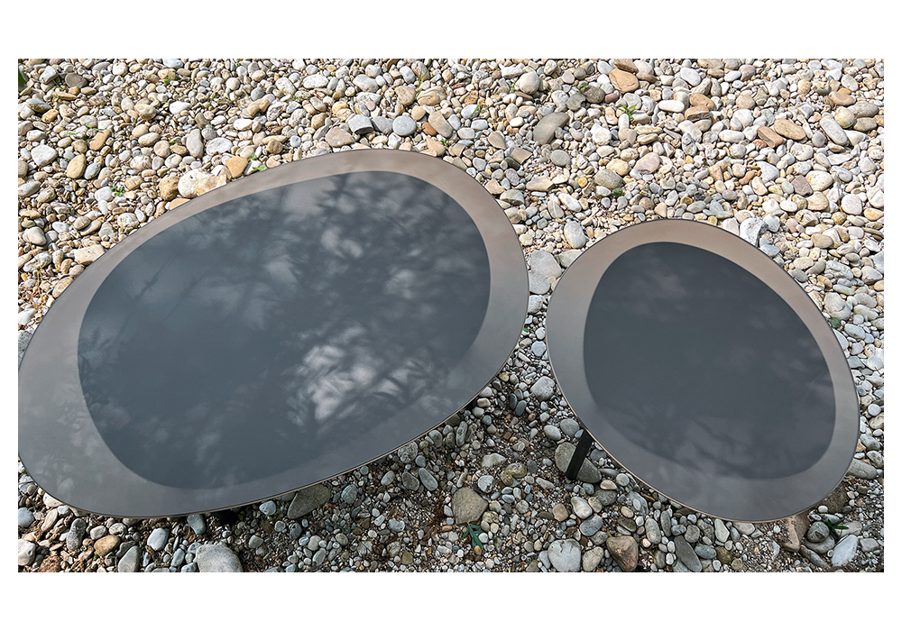 Tsuki diseñada por Gordon Guillaumier para Alf Dafrè es una mesita con estructura en metal pintado brillo moka y tablero en vidrio templado bronce satinado y alambre redondo satinado.