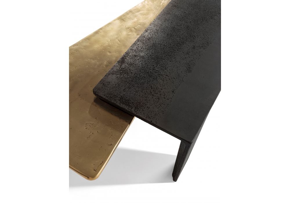 Lego diseñada por Draga & Aurel para Visionnaire es una mesa de forma cuadrangular estructurada por dos piezas colocadas una al lado de la otra. La mitad está realizada en hormigón negro envejecido y la otra mitad en aluminio fundido con una superficie pulida a mano y pigmentada con acabado dorado. Lego está disponible en diferentes acabados sólo la mitad en aluminio.