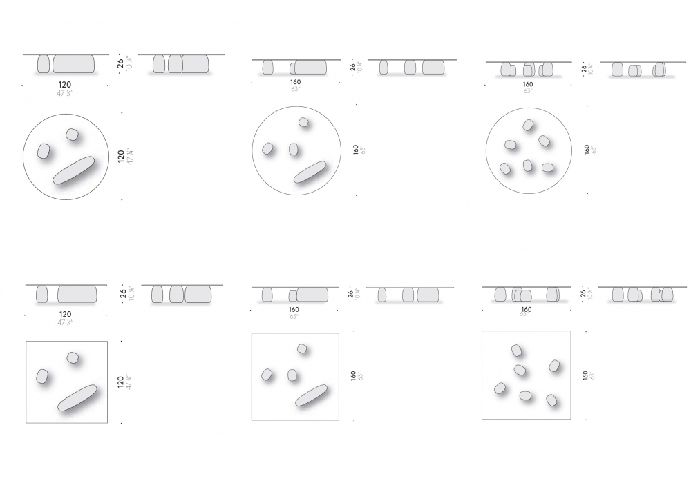 | Dimensiones | Ø 120 x H 26 cm; Ø 160 x H 26 cm; Ø 160 x H 26 cm; 120 x 120 x H 26 cm; 160 x 160 x H 26 cm; 160 x 160 x H 26 cm. |