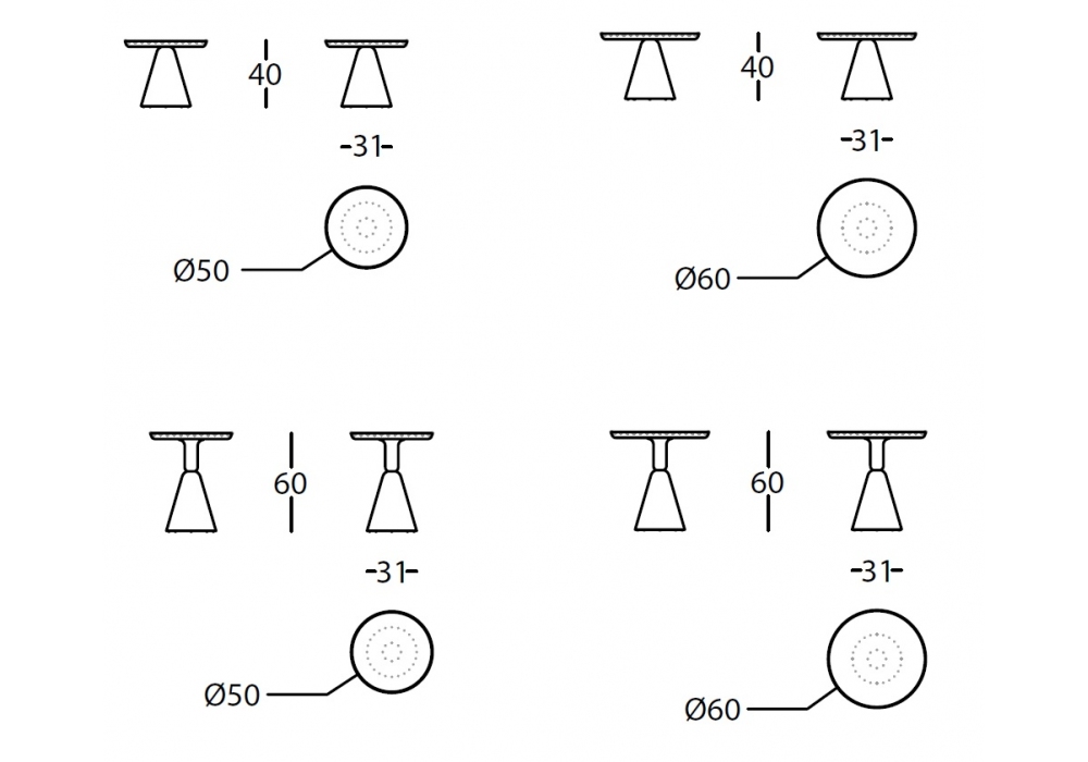 | Dimensiones | • Ø 50 x H 40 cm; • Ø 60 x H 40 cm; • Ø 50 x H 60 cm; • Ø 60 x H 60 cm |