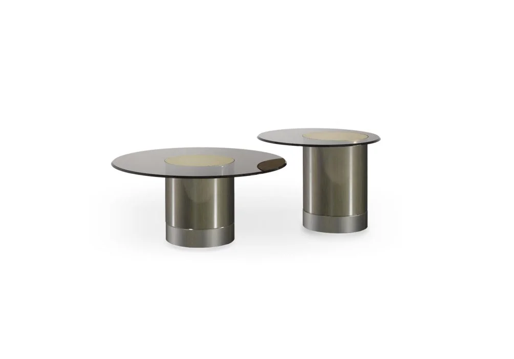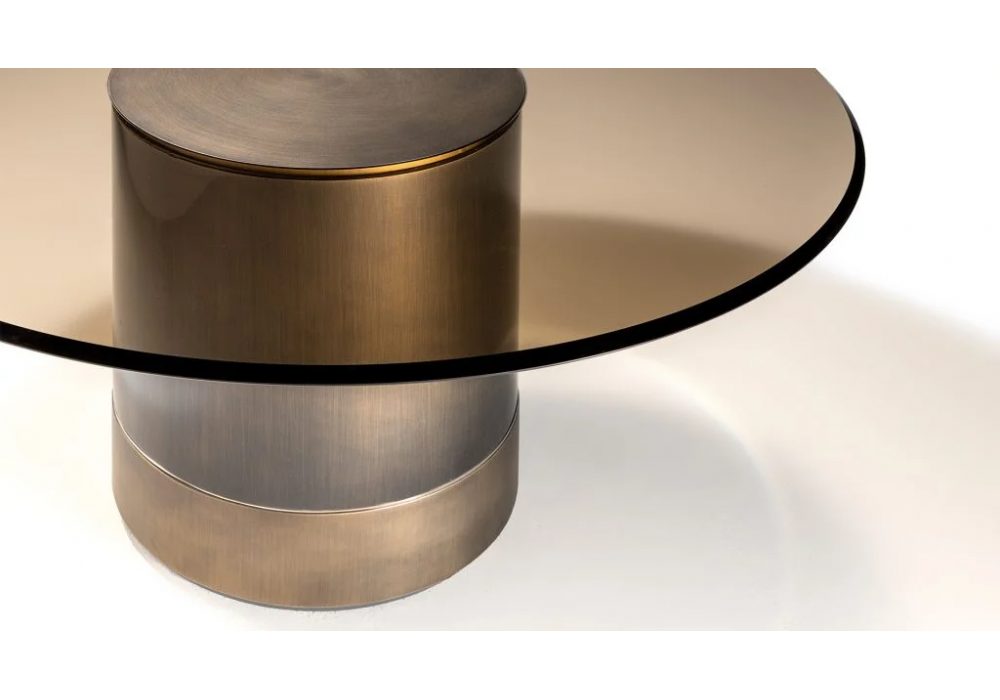 Tau 40 Steel Vetro diseñada por Riccardo Lucatello para Reflex Angelo es una mesa auxiliar con base cilíndrica pintada en acabado latón oscuro brillante con parte inferior en latón satinado mate. Placa de unión de acero pulido. Tapa de cristal bronce de 10 mm de espesor con bisel de 45°, colocada en el centro.