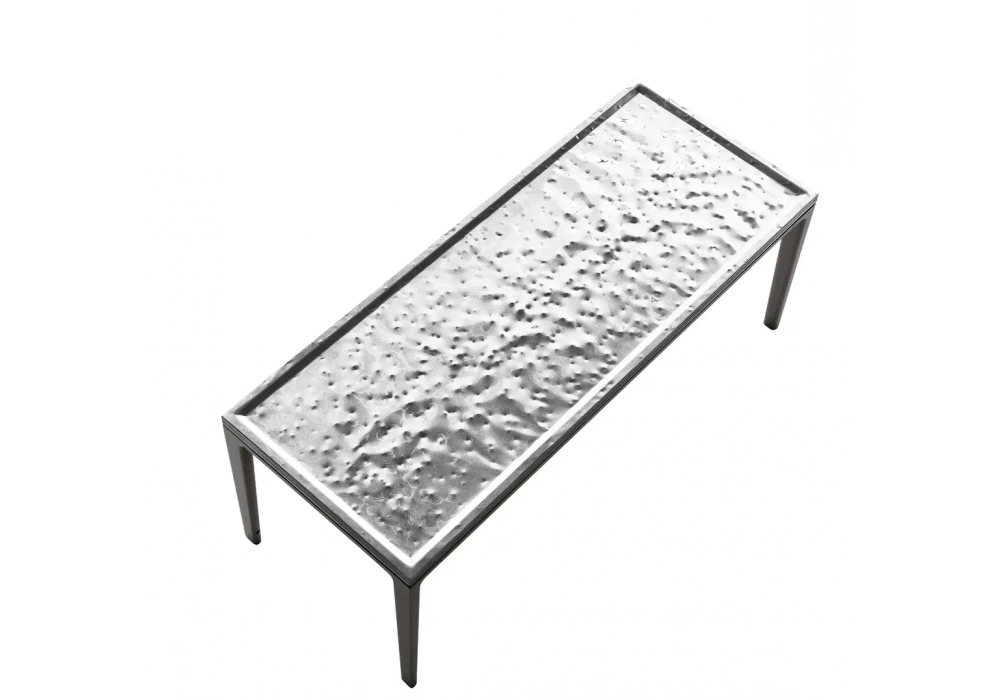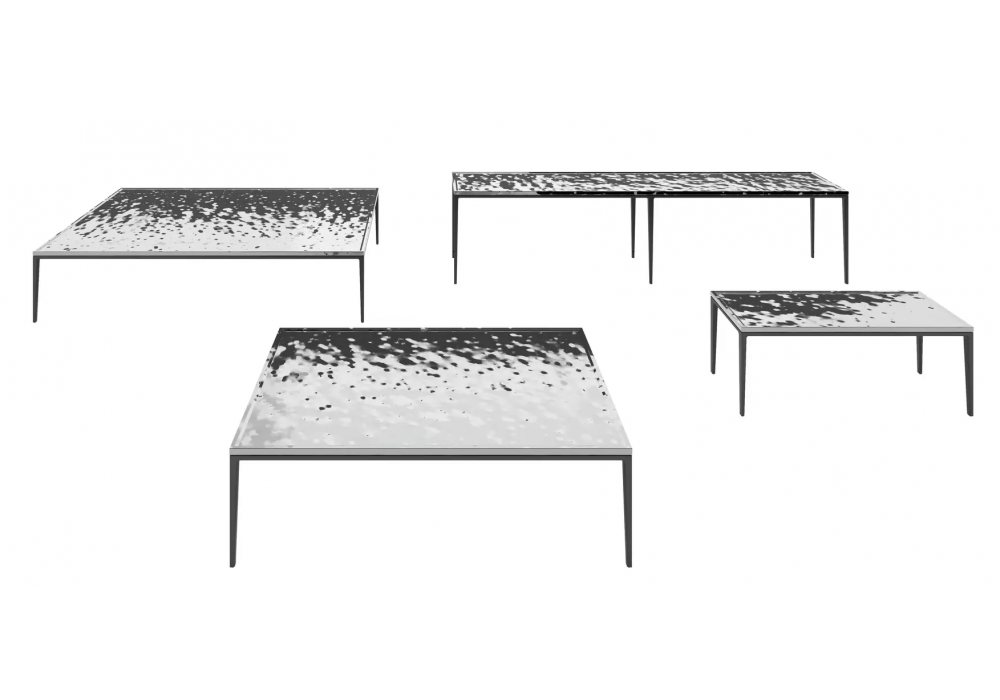 Soleide diseñada por Antonio Citterio para Maxalto es una mesita realizada con un tablero en acero martillado espejado color peltre y una estructura pintada en diferentes acabados.