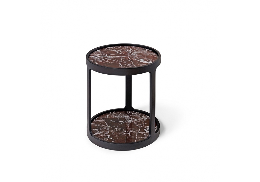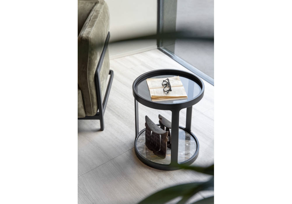 Bergère diseñada por Enrico Cesana para Conte Casa es una mesa auxiliar realizada con base y tablero en mármol o cristal y estructura en madera maciza redondeada y lacada. Disponible en diferentes acabados.