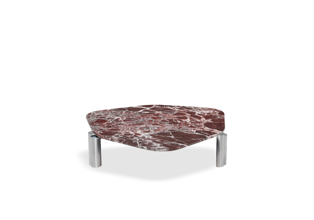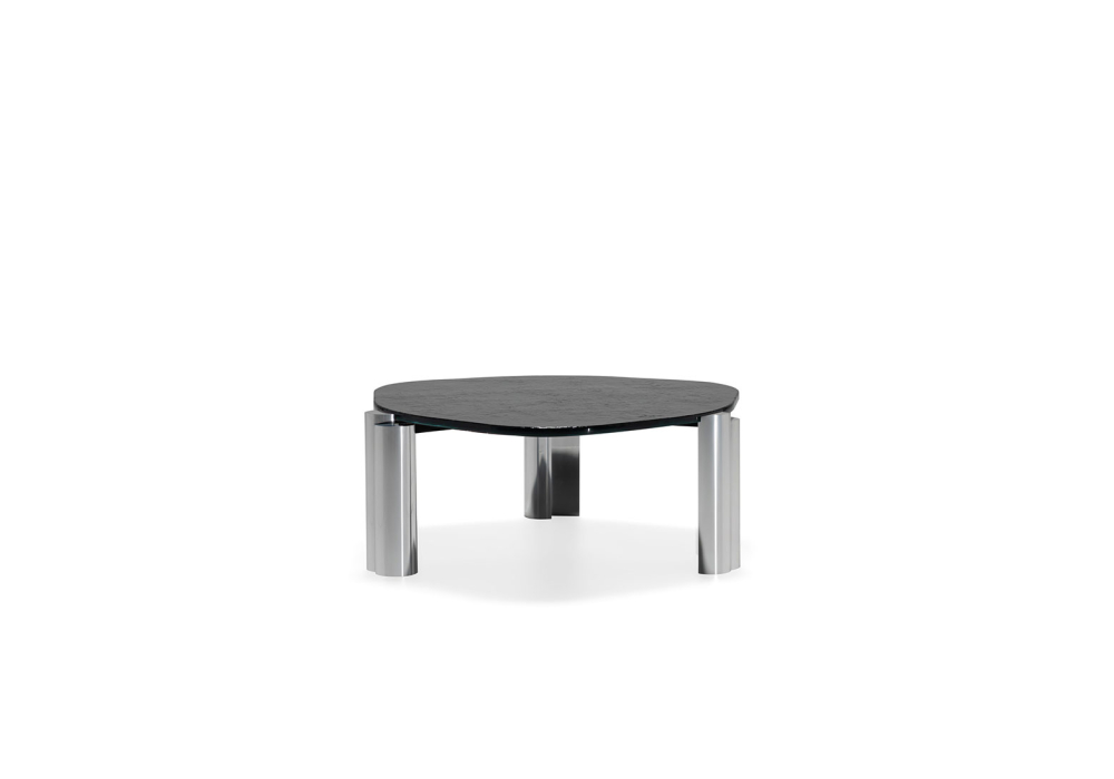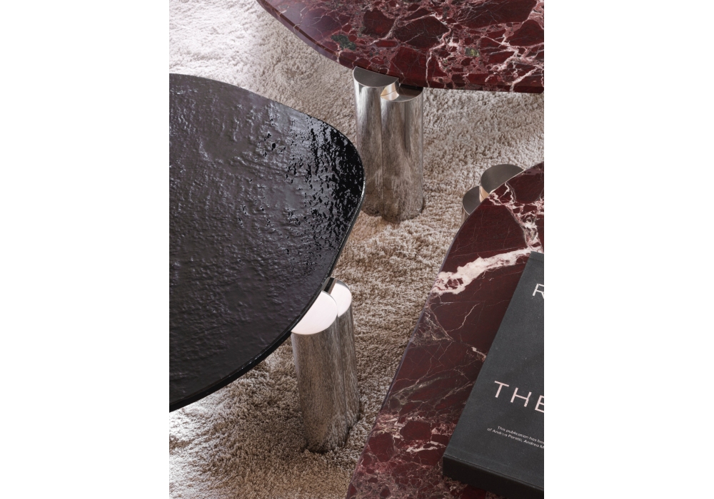 Maylis diseñada por Christophe Delcourt para Molteni&C es una mesita con tablero hexagonal multiforme, disponible en mármol, vidrio templado y lacado brillante. Sus tres patas de apoyo de aluminio brillante, con forma de media luna, crean un contraste visual con el material del tablero. También disponible en diferentes medidas.