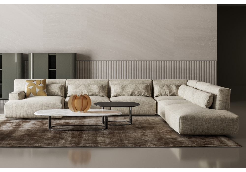 Isabey diseñada por Gabriele y Oscar Buratti para Bonaldo es una mesa de centro con base de metal y tablero en cristal, mármol o madera en varios acabados.