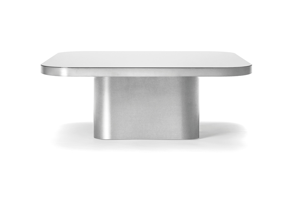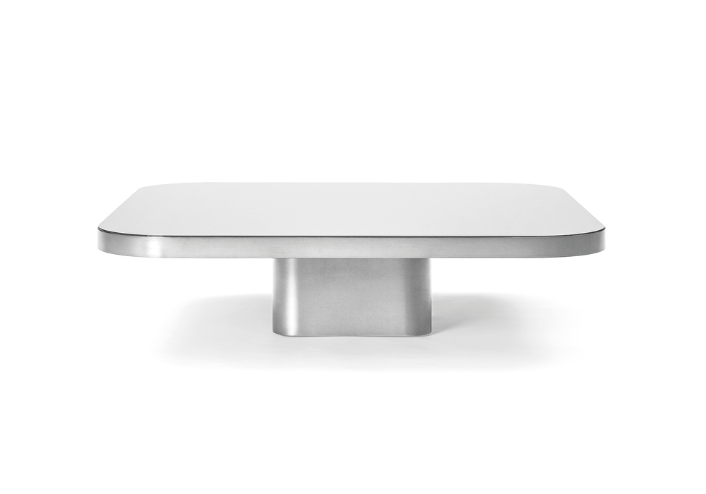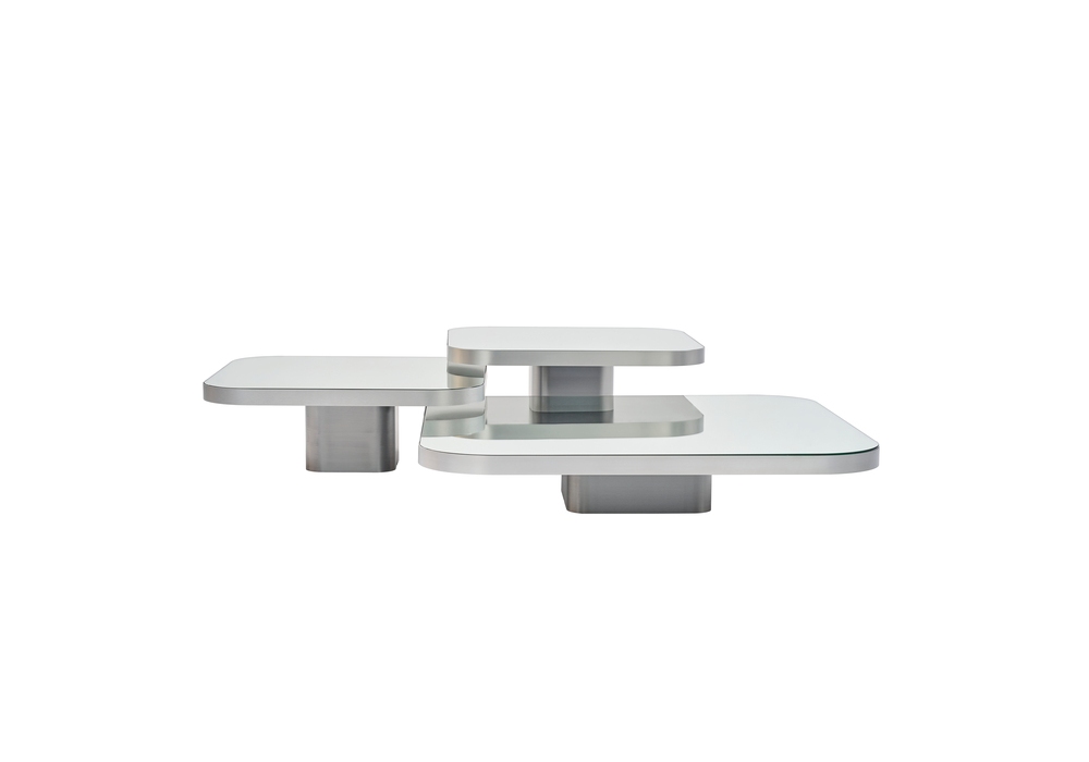 Bow Silver diseñada por Guilherme Torres para ClassiCon es una mesita de aluminio macizo lacado transparente. Tapa de cristal con acabado espejo o lacado negro.