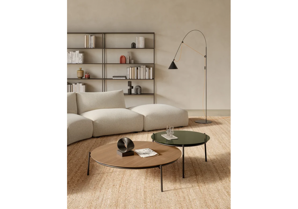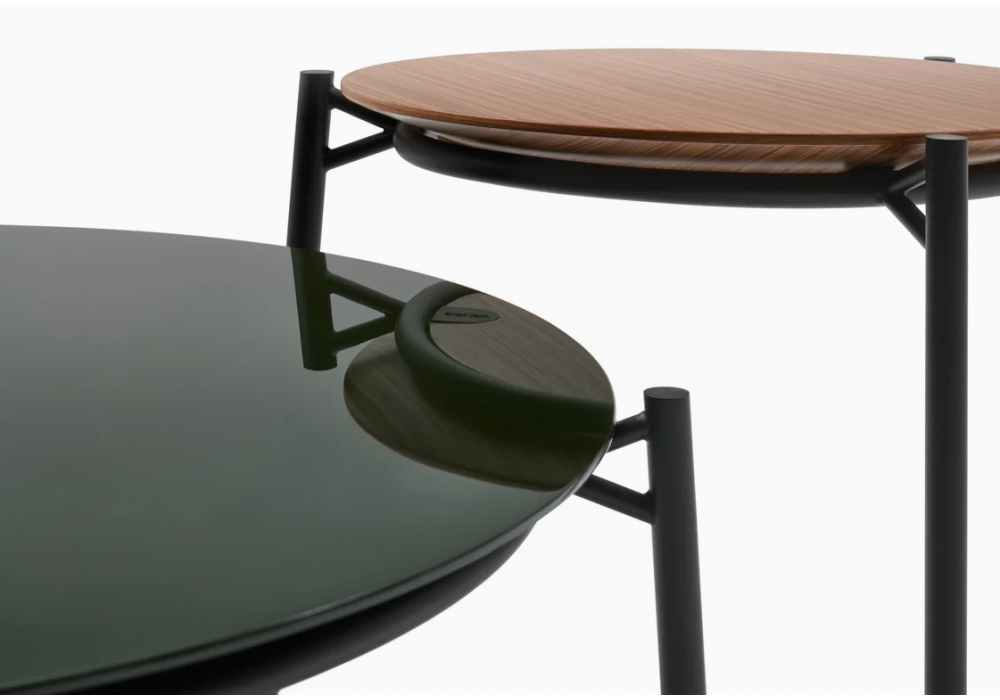 Cantle diseñada por Marco Lavit para MDF Italia es una mesita con estructura pintada en grafito mate. Tablero en laca brillante o con acabado en madera.